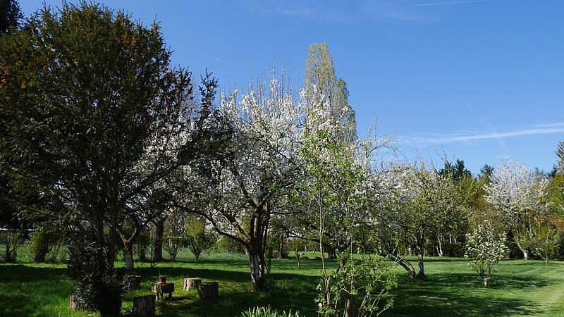 En fonction de la saison, vous pouvez jouir de nos nombreux arbres fruitiers, pommiers, poiriers, cerisiers, pêchers, noisetiers, framboisiers, mures, myrtilles…